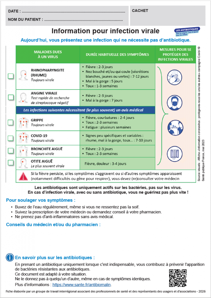 Information pour infection virale : Adaptation de l’ordonnance de non-prescription de l’assurance maladie Téléchargeable ici . Ces fiches ont été élaborées par RéPIA PRIMO avec un groupe de travail interrégional associant professionnels de santé, représentants des usagers et associations : https://antibioresistance.fr/bon-usage-des-antibiotiques/fiches-pratiques